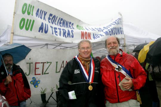 Les intervenants au micro ont été nombreux(ses) dont les responsables du collectif, A. Waechter, un gars de la FED, Alsace nature, Paysages d'alsace, Rabodeau environnement et d'autres… F. Lung PNPP du CV (je l'avais vu juste avant) a re-précisé que nous étions là pour nous opposer au projet des éoliennes du Bonhomme-Louschbach, ce qui était utile car le discours virait vers l'opposition totale à l'énergie éolienne. La position de la FDCV a été bien applaudie c'est tout de même 115 associations, >30.000 membres... En face, de temps à autre, et à travers le smog, on entendait des applaudissements comme de notre côté mais pas en même temps. Apparemment notre sono marchait mieux que la leur. Il y a eu quelques contacts oraux entre eux, et nous avec un grand soleil cela aurait pu donner autre chose.